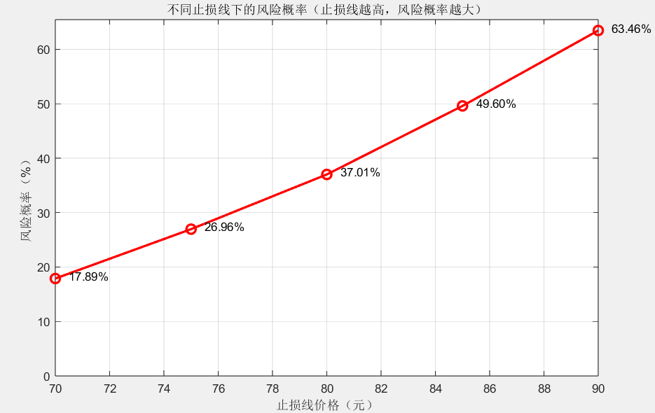 - 图 3 中,止损线从 70 元提高到 90 元,风险概率从 17.89% 增至 63.46%,说明 “止损线越严格,触发止损的风险越高”,为投资决策提供量化依据;