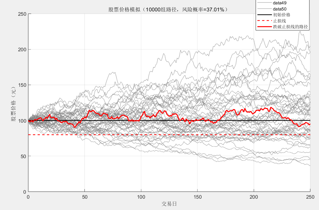 - 图 1 中,灰色线为 10000 组模拟路径中的前 50 组,红色线为 “跌破止损线” 的路径,可直观看到股价的随机波动;