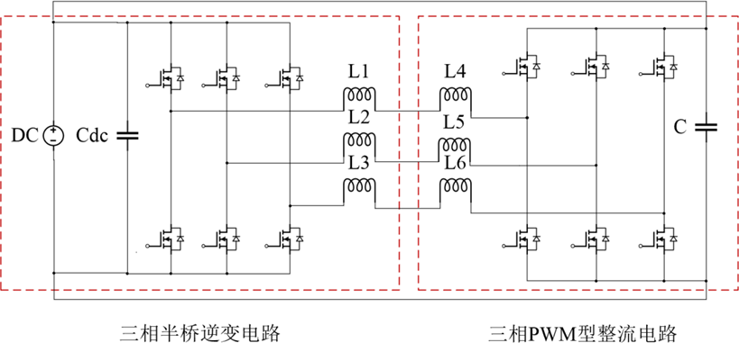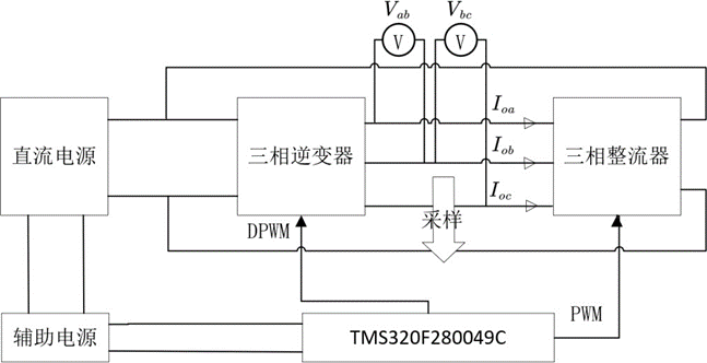 直流电源为三相逆变器提供初始能量,逆变器在 DSP 控制下通过DPWM完成 DC-AC 转换,输出交流电直接进入三相整流器。