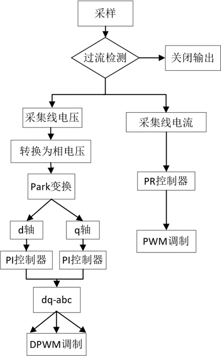 控制器 TMS320F280049C持续对逆变器输出电压,同时对三相交流电流进行实时采样。一旦发生过流故障,平台将立即关闭输出,确保设备安全。如电流没过流,则依据 PI 和 PR 控制实现,对电流电压的控制。