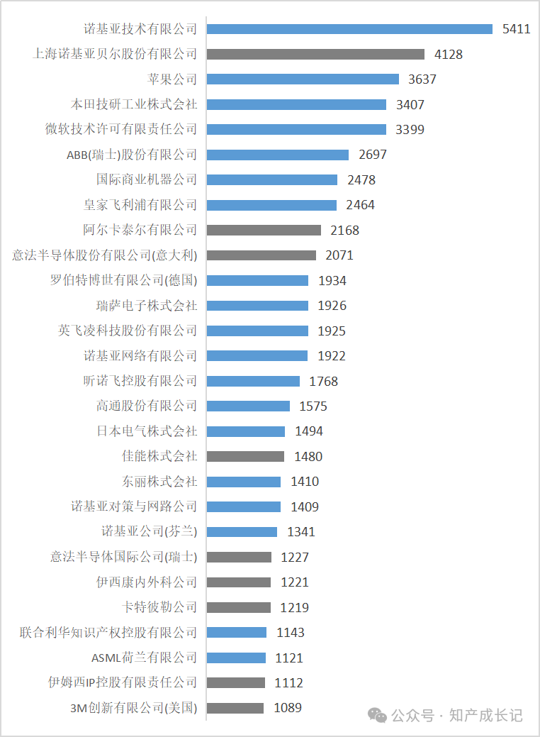 此外,针对同时在港专和金杜客户列表中的、金杜的前五大客户(即,诺基亚技术有限公司、苹果、本田技研工业株式会社、微软技术许可有限责任公司和ABB瑞士股份有限公司),我们还分析了港专和金杜的专利申请量趋势。