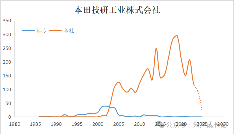 如下图4所示,港专代理本田技研工业株式会社推测比金杜早至少15年(专利申请的申请日最早分别在1986年之前、2001年);在金杜代理本田的第二年(即2002年),港专的年度代理量达到最高峰,随后呈下降趋势;自2003年开始,金杜的年度代理量反超港专,并快速增长至2019年。