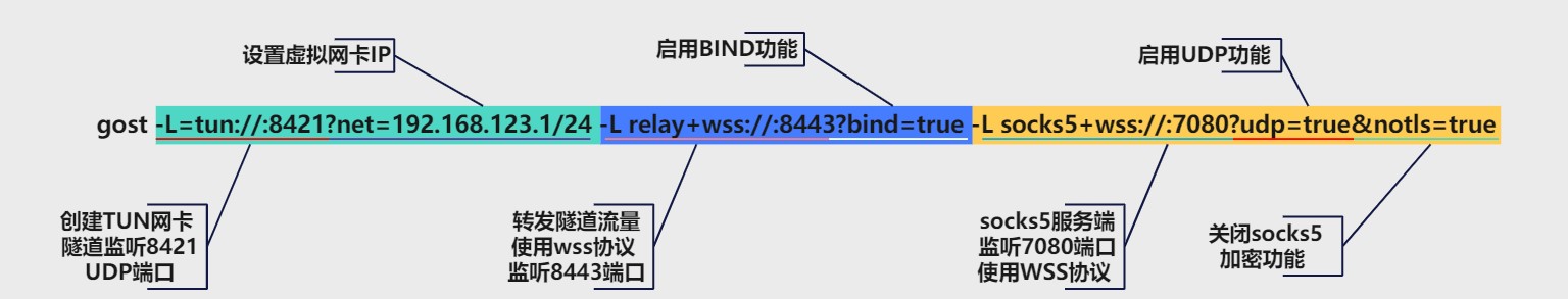 @echo offstart gost.exe所在的实际绝对路径\gost.exe -L="tun://:0/:8421?net=192.168.123.2/24&name=gost_tun" -F relay+wss://服务端IP:8443pause