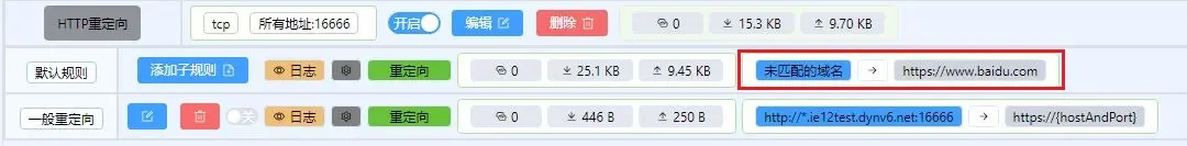 滚动页面 》 点开默认规则 》 修改服务类型为 重定向 》