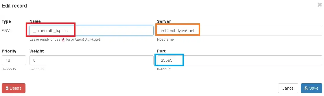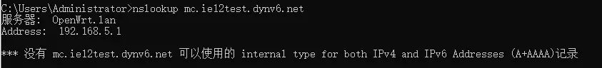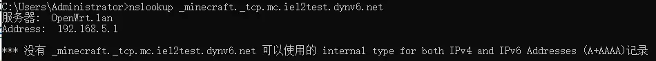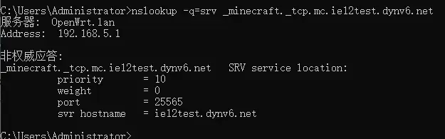 例如: nslookup -q=srv _minecraft._tcp.mc.ie12test.dynv6.net