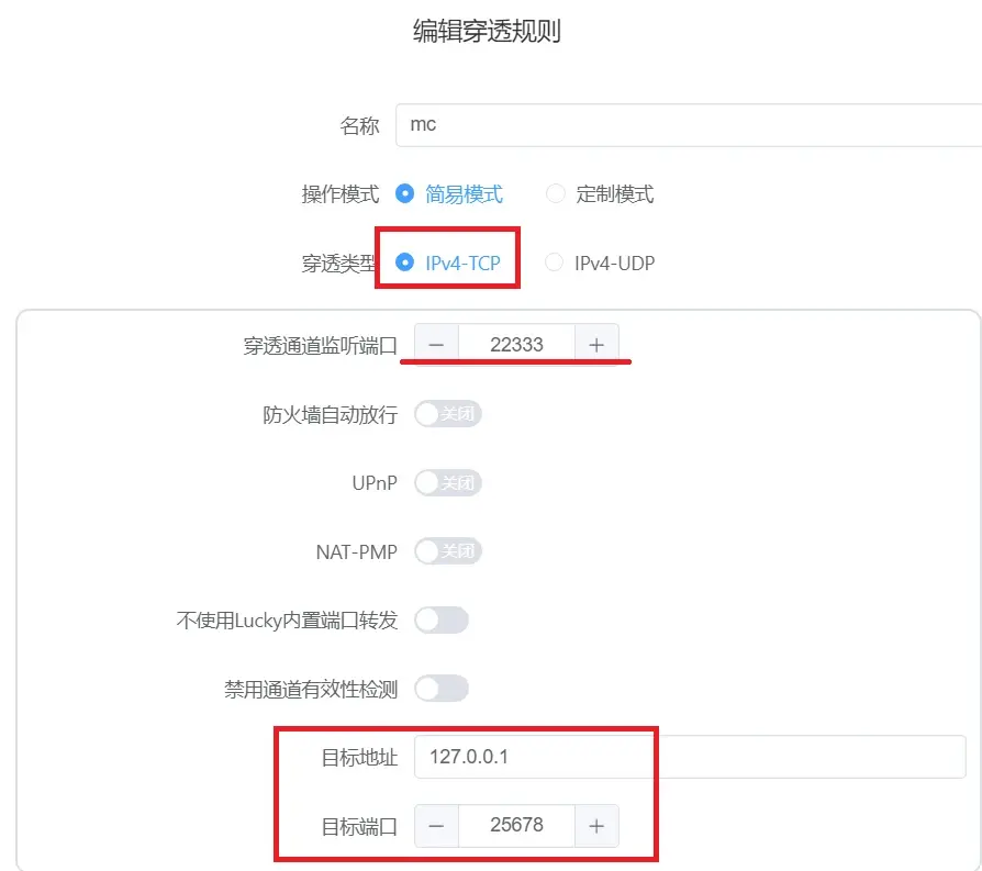 目标端口: 设置为mc服务端监听的端口 这里用的是25678