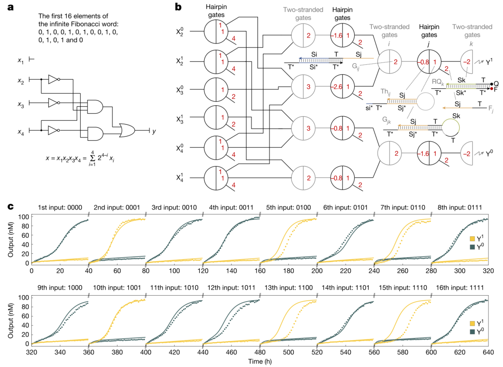 图6 | 可重用逻辑门的组合性。 a. 生成斐波那契词前16元素的三层电路。 b. 抽象电路与DNA实现。 c. 16轮计算中的电路性能一致性。