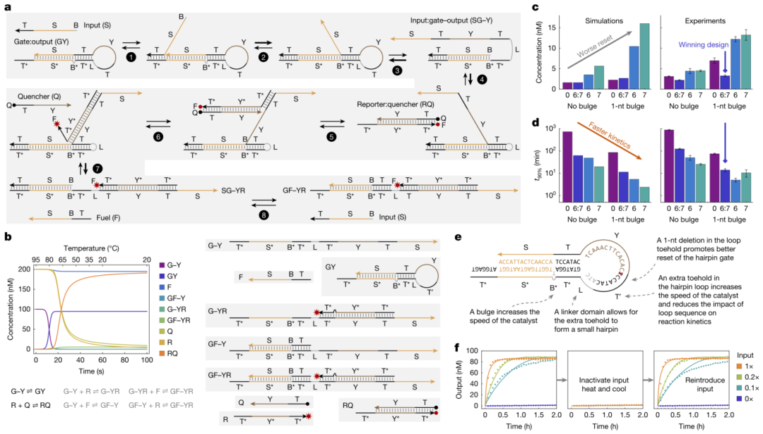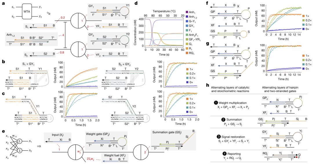 图3 | 动力学与级联。 a. 双输入“赢家通吃”功能实现。 b,c. 无环趾环与有环趾环的DNA催化剂动力学比较。 d. 复位模拟。 e. 加权求和功能实现。 f,g. 发夹门与双链门的下游级联比较。 h. 催化与化学计量反应交替层实现抽象功能。
