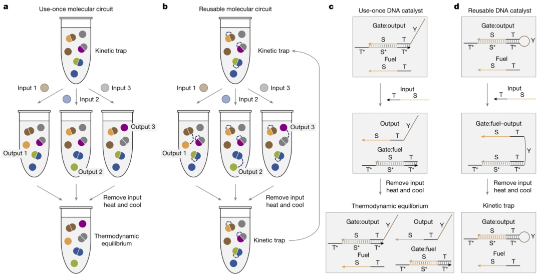 图1 | 热驱动可重用分子电路的概念。 a. 一次性分子电路。不同颜色的球代表不同单体,输入可催化解离二聚体并释放输出。 b. 可重用分子电路。虚线表示单体间的强柔性连接,热可复位系统至动力学陷阱状态。 c. 一次性DNA催化剂。 d. 可重用DNA催化剂。彩色线条代表DNA链,箭头表示3'端。