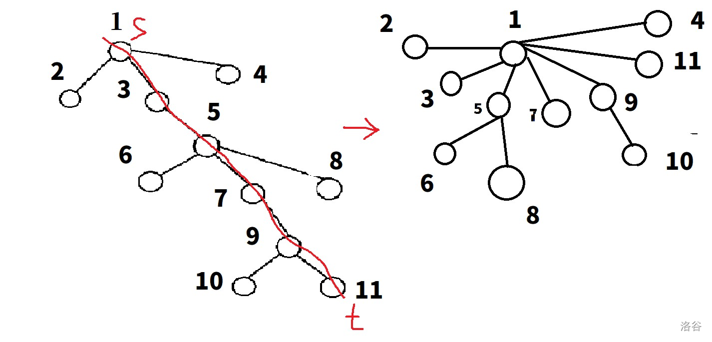 容易发现选取某一个点为起点后,不仅到终点的路径上的点无需再操作一次,其他与其相邻的点也不需要再操作了。那我们每次操作贪心地选取当前拥有深度大于 \(1\)叶节点最多的节点就能保证操作次数最少了。下面是示意图。