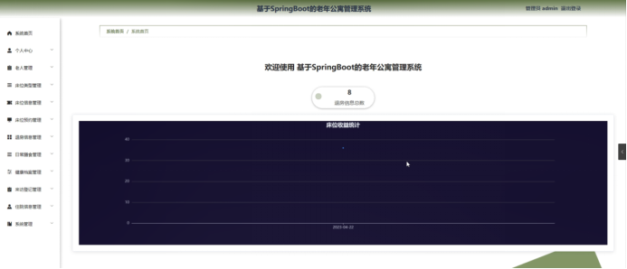 管理员进入主页面,主要能力包括对个人中心、老人管理、床位类型管理、床位信息管理、床位预约管理、退房信息管理、日常膳食管理、健康档案管理、来访登记管理、住院信息管理、系统管理等进行操作。管理员主页面如图5-3所示: