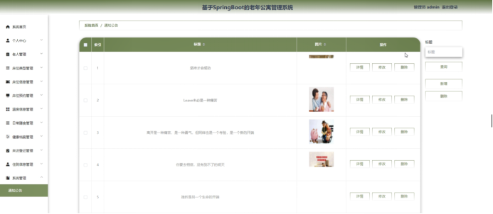 管理员点击系统管理。在通知公告页面输入标题进行查询、新增或删除通知公告列表,并根据需要对通知公告详情信息进行详情、修改或删除操作;如图5-12所示: