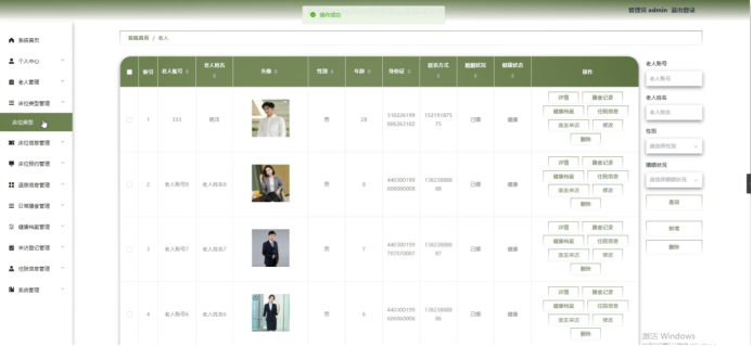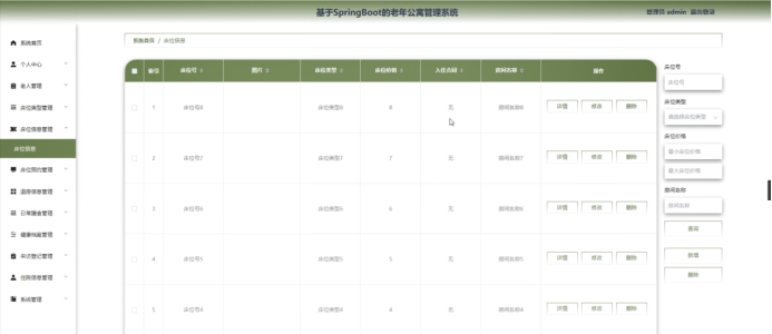 管理员点击床位预约管理。在床位预约页面输入床位号、床位类型、老人账号和选择是否通过进行查询或删除床位预约列表,并根据应该对床位预约详情信息进行详情、修改或删除操作;如图5-6所示: