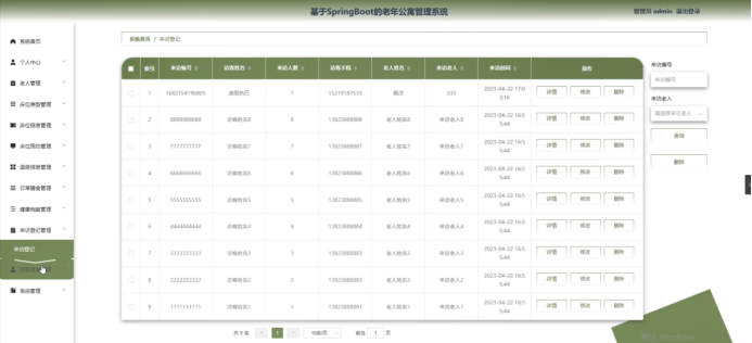 管理员点击来访登记管理。在来访登记页面输入来访编号和选择来访老人进行查询或删除来访登记列表,并根据需要对来访登记详情信息进行详情、修改或删除操作;如图5-10所示: