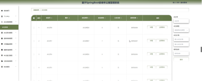 老人点击床位信息管理。在床位信息页面输入床位号、床位价格、房间名称和床位类型进行查询床位信息列表,并根据需要对床位详情信息进行详情或立即预约操作;如图5-14所示: