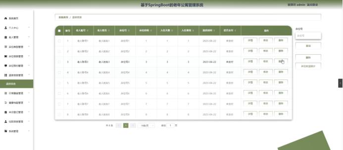管理员点击退房信息管理。在退房信息页面输入床位号进行查询、床位收益统计或删除退房信息列表,并根据需要对退房详情信息进行详情、修改或删除操作;如图5-7所示: