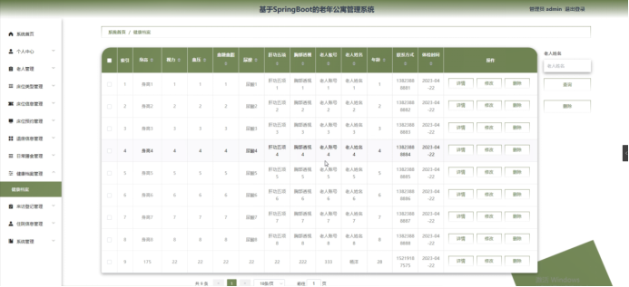管理员点击健康档案管理。在健康档案页面输入老人姓名进行查询或删除健康档案列表,并根据得对健康档案详情信息进行详情、修改或删除操作;如图5-9所示: