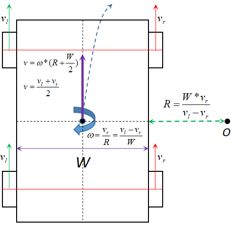 滑移小车的运动方式为左侧两个轮子速度一致 \(v_l\),右侧两个轮子的速度一致为 \(v_r\),当小车需要向前运动时,\(v=v_l=v_r\) 即可实现小车的前向运动,当小车需要左转时,小车的右轮速度大于左轮速度\(v=\frac{v_r+v_l}{2}, \omega=\frac{v_r-v_l}{W}\);当小车需要右转时,小车的左轮速度大于右轮速度\(v=\frac{v_r+v_l}{2}, \omega=\frac{v_l-v_r}{W}\);由于在转动过程中会出现小车车轮滑动的情况,因此称为滑移式小车模型。