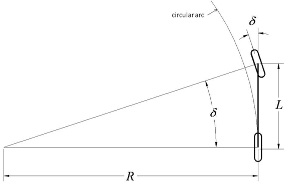 其中 \(δ\) 是前轮的转向角,\(L\) 是前轴和后轴之间的距离(轴距),\(R\) 是后轴在给定转向角下沿着行驶的圆的半径。该模型相当好地近似了汽车在低速和中等转向角下的运动。