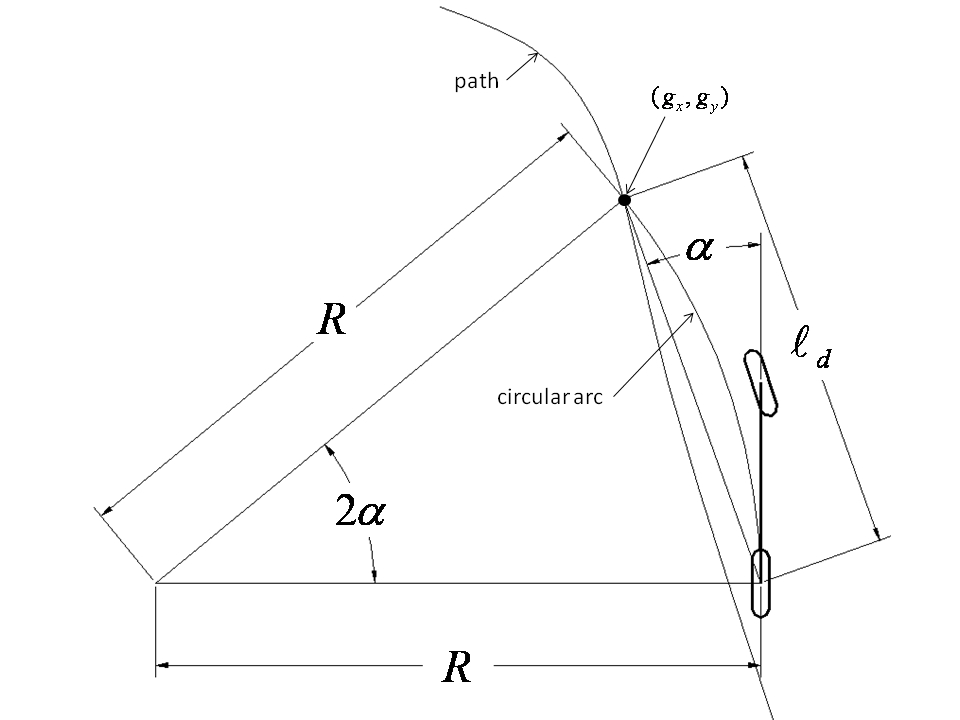 纯追踪法包括几何计算连接后轴位置和车辆前方路径上目标点的圆弧的曲率。目标点由传感器确定。从当前后轴位置到期望路径的前进距离\(l_d\)。目标点 \((g_x,g_y)\) 。车辆的转向角 \(δ\) 可以仅使用目标点位置和车辆航向矢量与外观之间的角度 \(α\) 来确定。