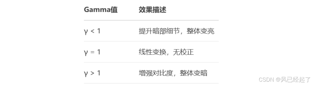 Gamma校正是一种非线性亮度调整技术(一定程度上还能够调节对比度),通过对图像像素值进行律变换,校正显示系统的非线性响应特性。其数学表达式为: