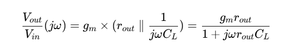 在小信号模型下,一个简单的OTA可以被等效为一个具有增益 (A_0) 和时间常数 (\tau = r_{out} C_L) 的一阶低通系统。其频响特性与RC低通滤波器在数学上同构。