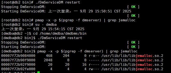 重启数据库生效 通过进程号查看内存库是否更换完毕,这里通过root用户重启没生效,切换dmdba用户重启之后才生效