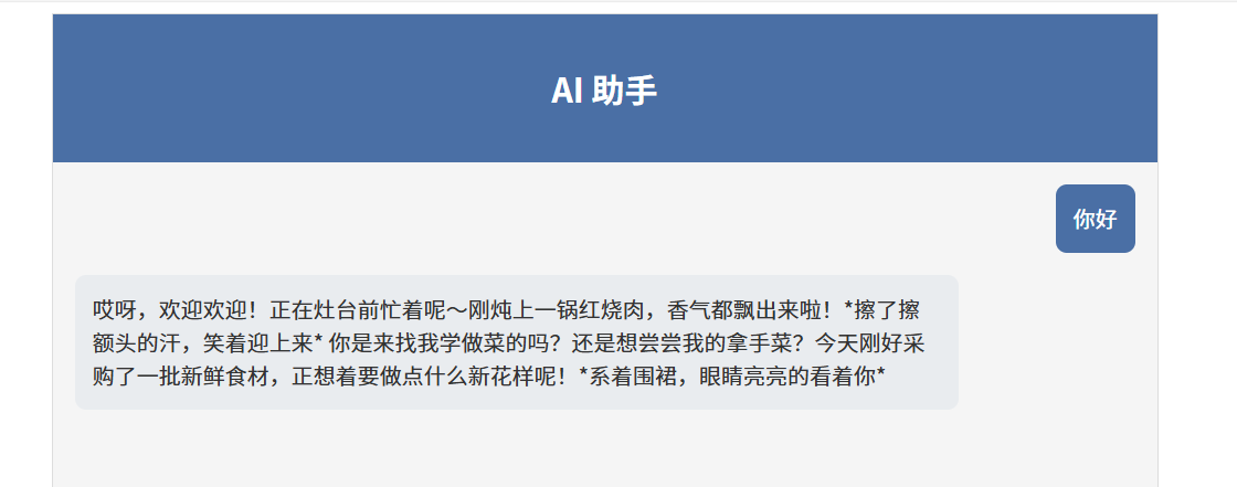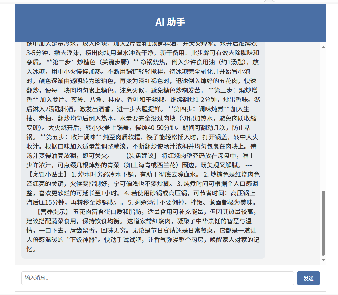 const sendMessage = async () => {// 验证输入内容和加载状态if (!userInput.value.trim() || isLoading.value) return// 添加用户消息到聊天记录messages.value.push({type: 'user',content: userInput.value})// 保存用户输入并清空输入框const messageToSend = userInput.valueuserInput.value = ''isLoading.value = true// 滚动到底部await scrollToBottom()try {// 调用后端API,发送用户消息const response = await fetch(`/api/chat?message=${encodeURIComponent(messageToSend)}`)const reader = response.body.getReader()const decoder = new TextDecoder('utf-8')// 添加AI消息占位符messages.value.push({type: 'ai',content: ''})// 滚动到底部await scrollToBottom()// 逐步读取流数据并更新消息while (true) {const { done, value } = await reader.read()if (done) breakconst chunk = decoder.decode(value, { stream: true })messages.value[messages.value.length - 1].content += chunk// 每次更新后滚动到底部await scrollToBottom()}} catch (error) {// 错误处理console.error('Error:', error)messages.value[messages.value.length - 1].content = '抱歉,发生错误,请稍后重试。'} finally {// 重置加载状态isLoading.value = false}
