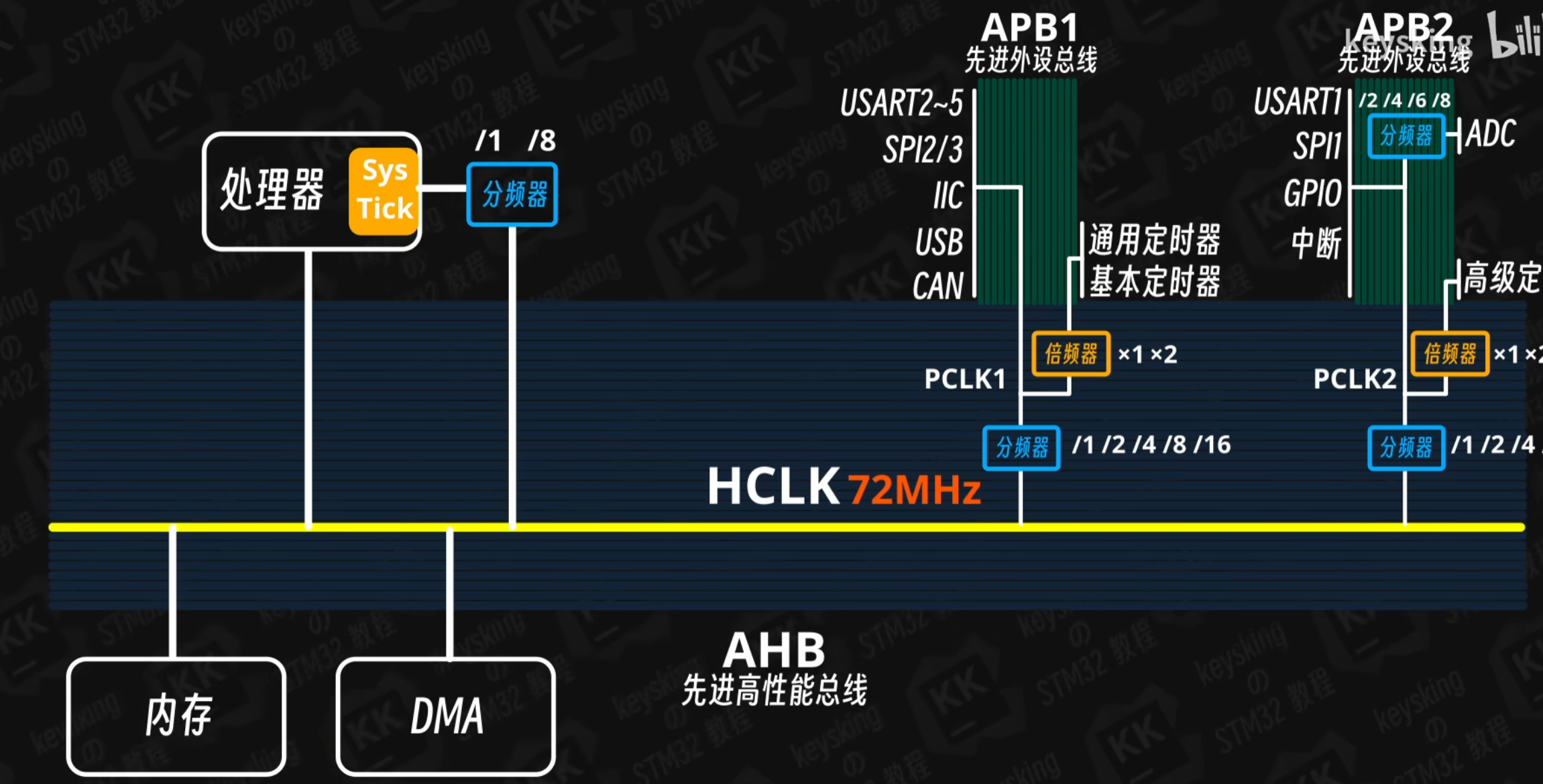 HCLK = AHB 总线时钟 = 内核、DMA、内存的工作频率