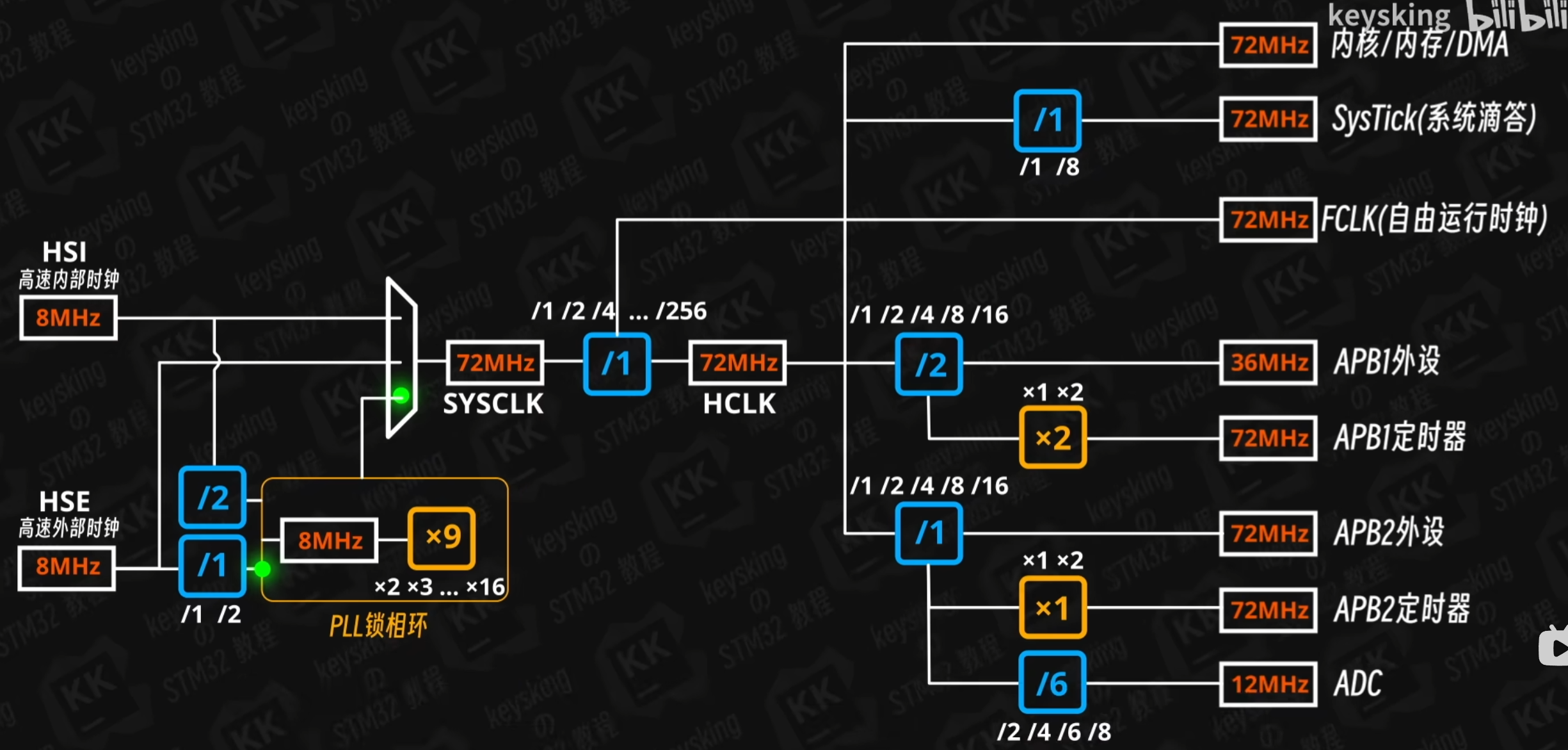 比如你图里:HSE 8 MHz → PLL ×9 → 72 MHz