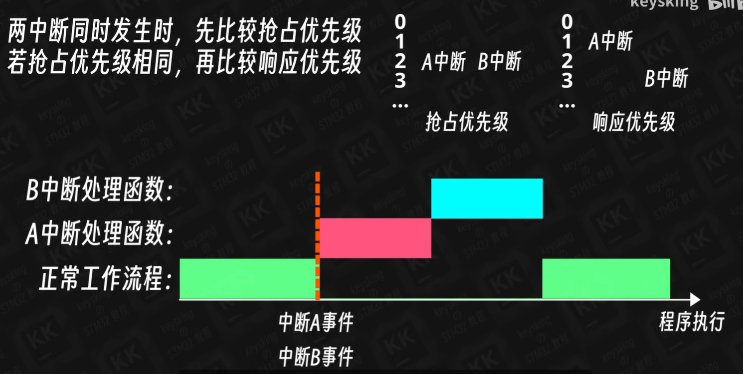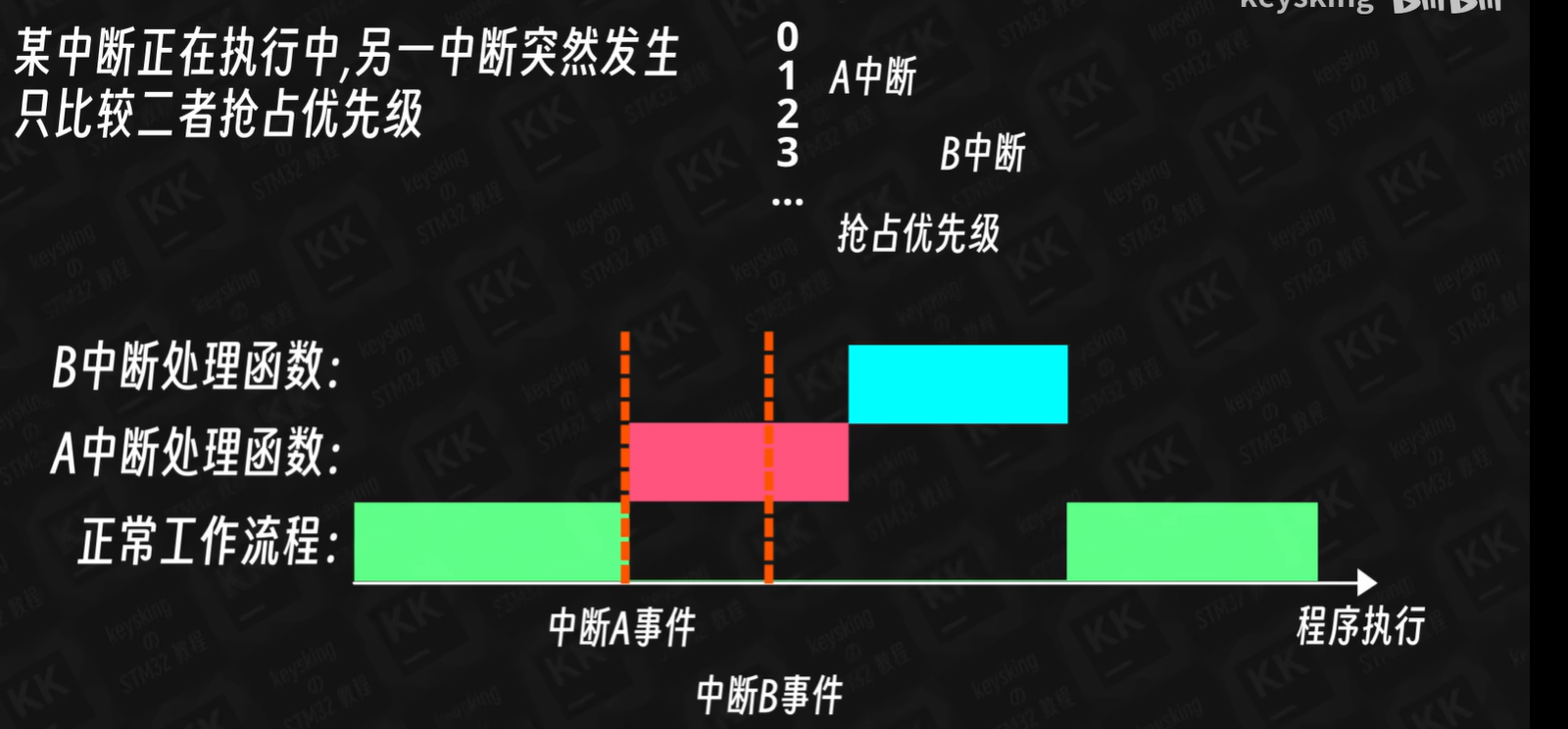 如果 A 中断在执行时,来了一个更高优先级的 B 中断,B 可以打断 A,先执行完再返回继续 A。