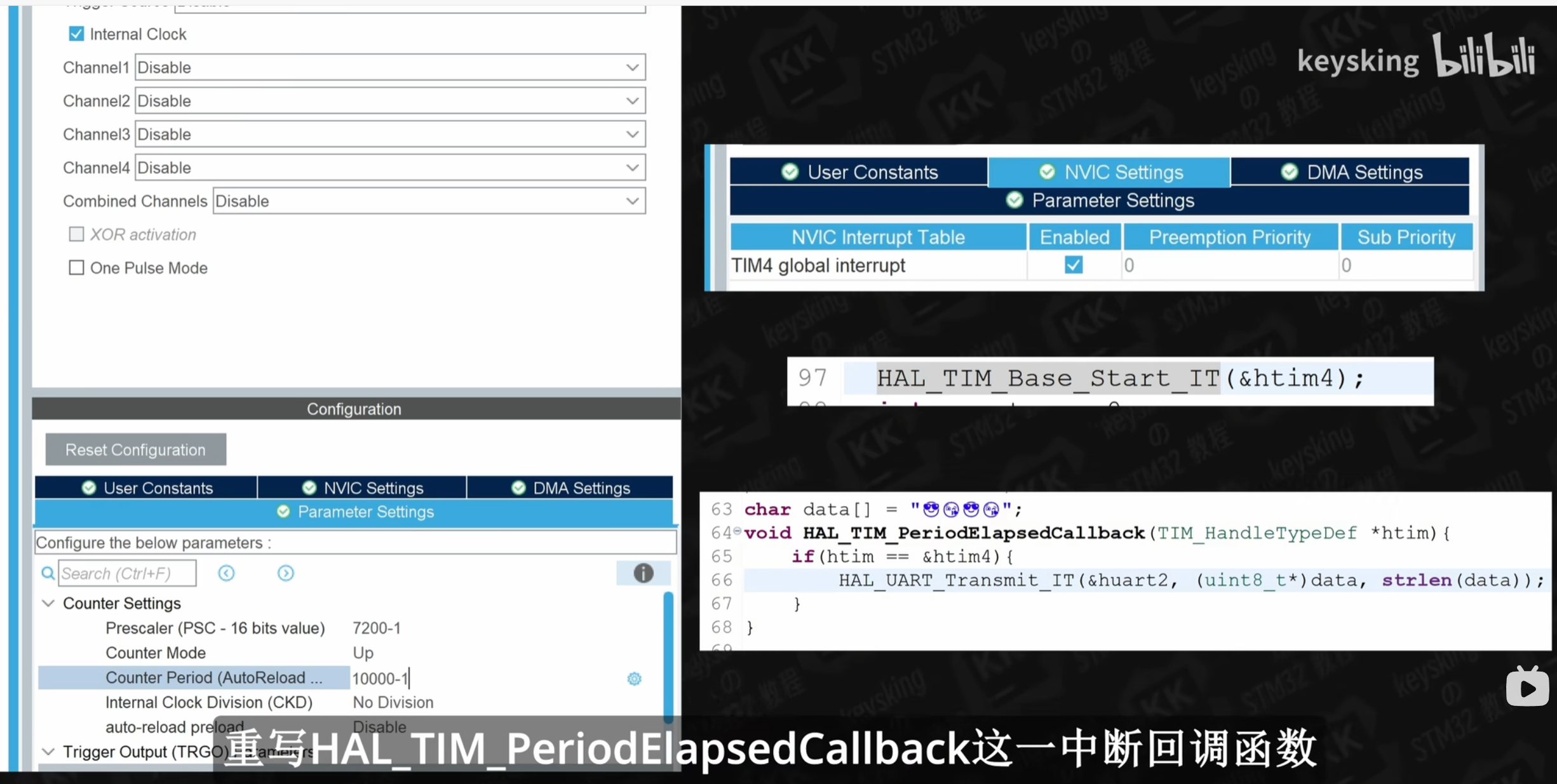 定时器溢出时自动触发 DMA,比如定时更新 DAC 输出波形,形成正弦波/三角波。