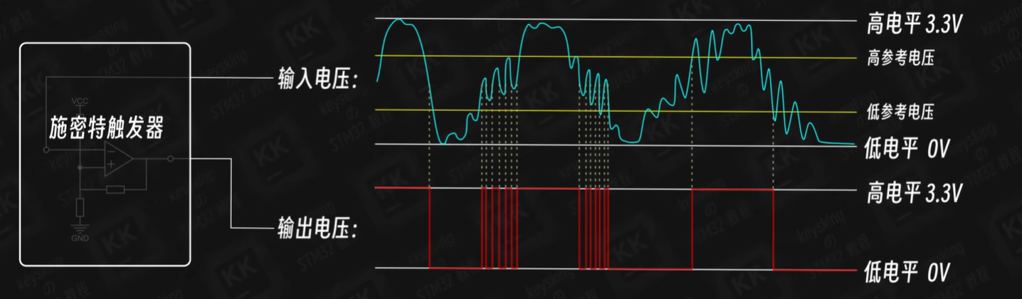施密特触发器的作用:稳定电平,给电平一个参考电压,高于这个参考电压就输出高电平,低于就输出低电平。