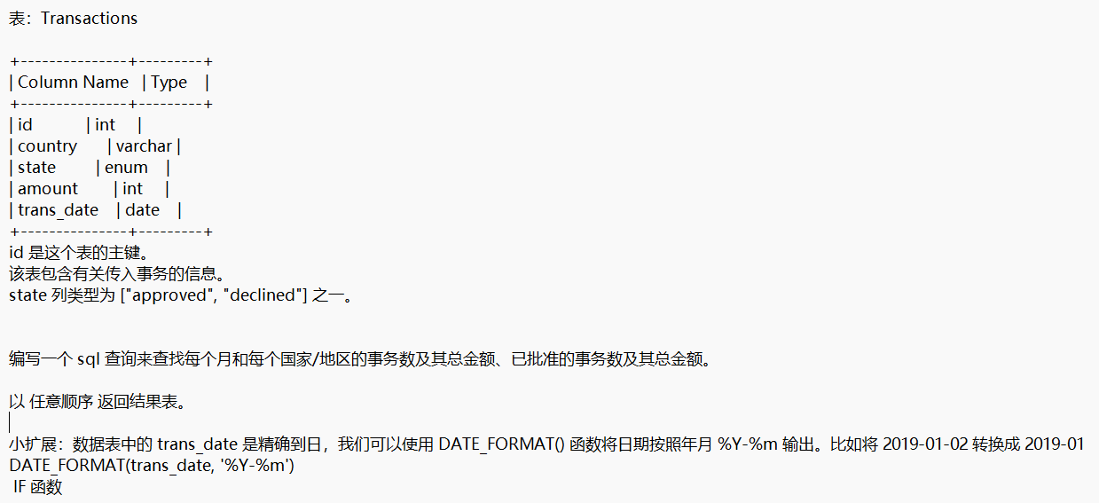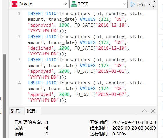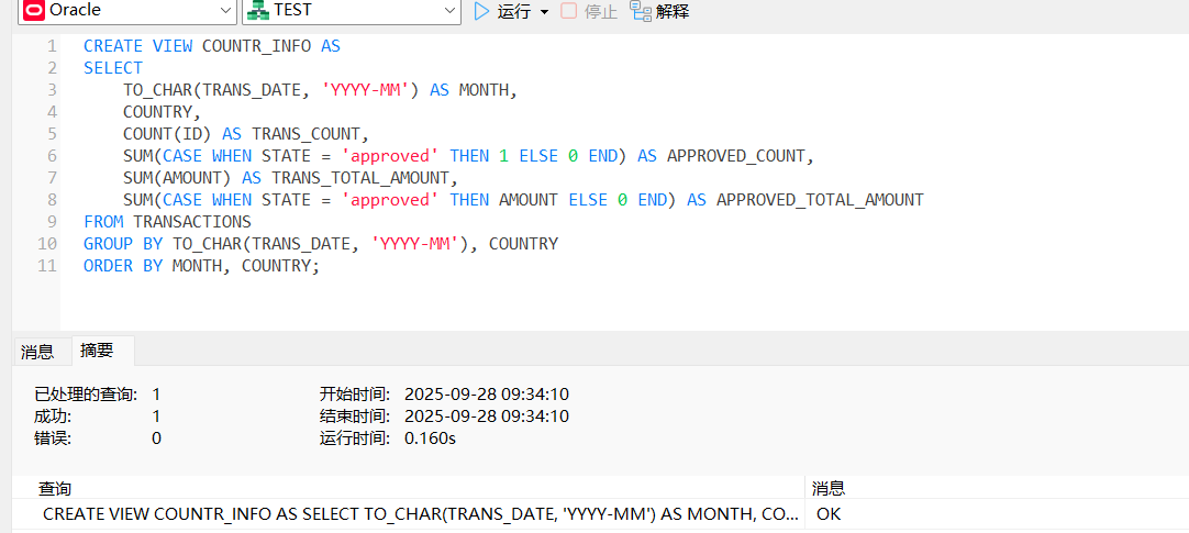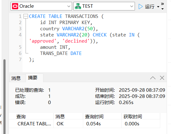 题目如下图,首先要创建Transactions表,然后插入信息,再创建视图,最后查询视图