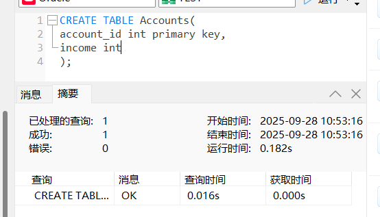 在 Navicat 中,打开 Oracle 数据库的查询编辑器,执行以下建表语句: