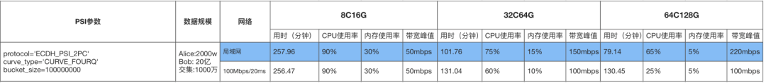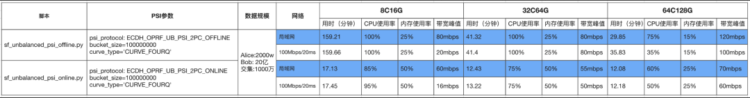 为了方便大家对比,同等硬件资源和数据规模下,对平衡PSI做了性能测试,报告如下:
