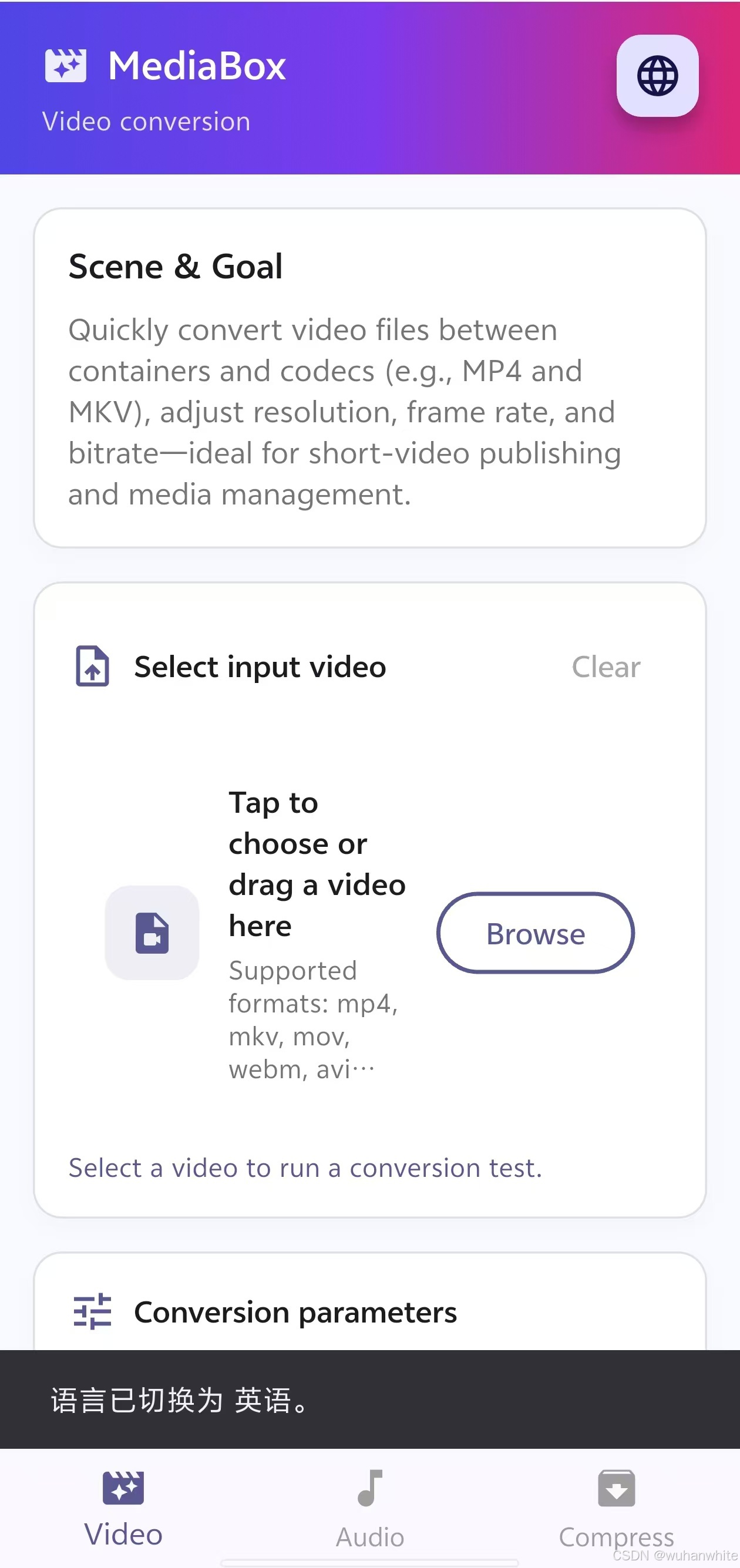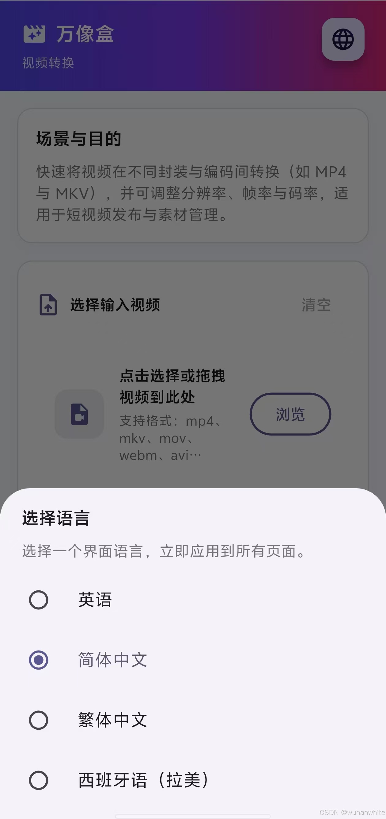 在手机上调试,一切正常。首页的 浏览按钮 能顺利打开相册,右上角的 语言切换功能 也能正常工作。 - • 但一旦用命令打包成 release APK(例如