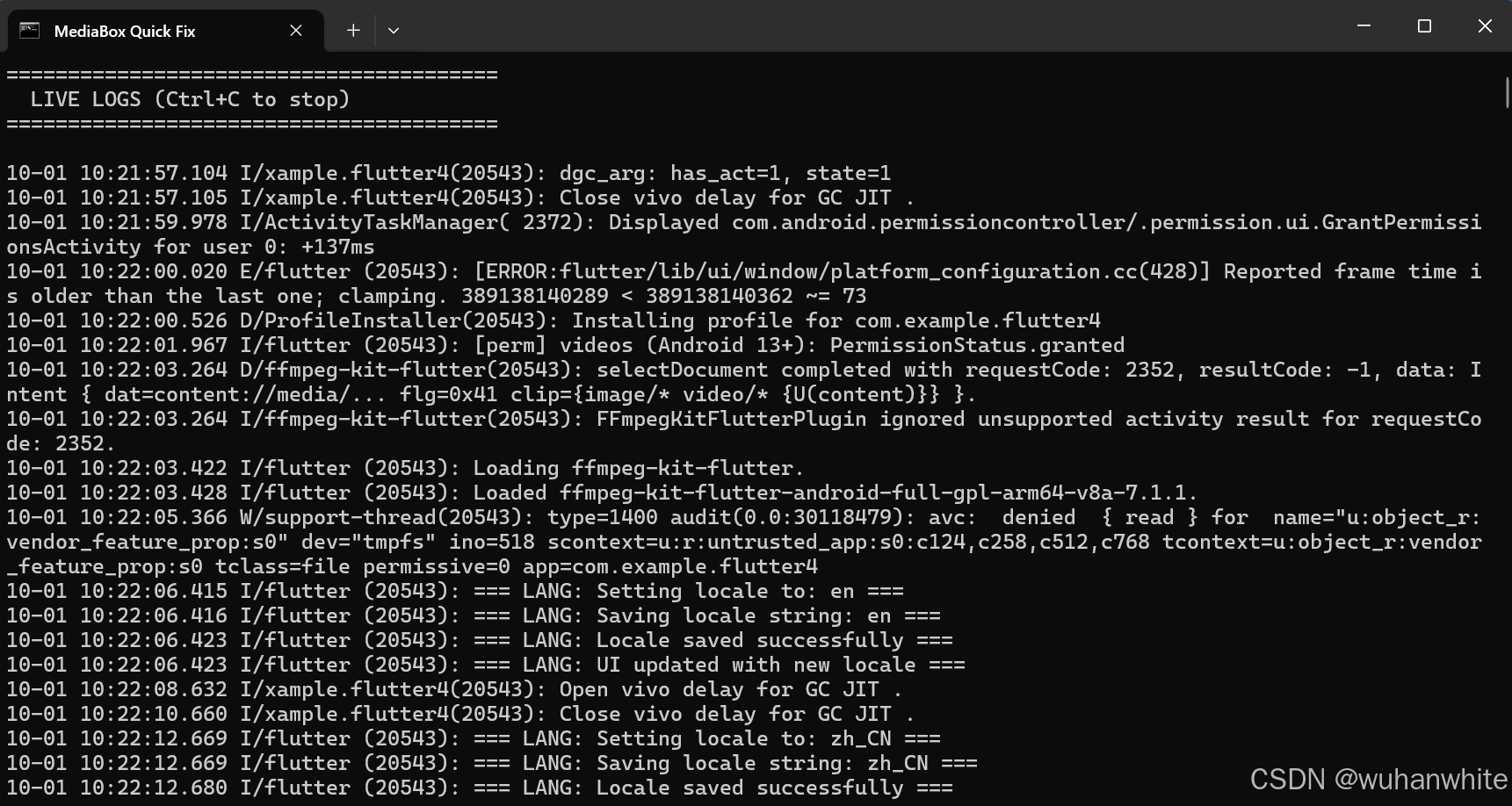 adb logcat -v time | findstr /i "flutter AUDIO LANG perm"