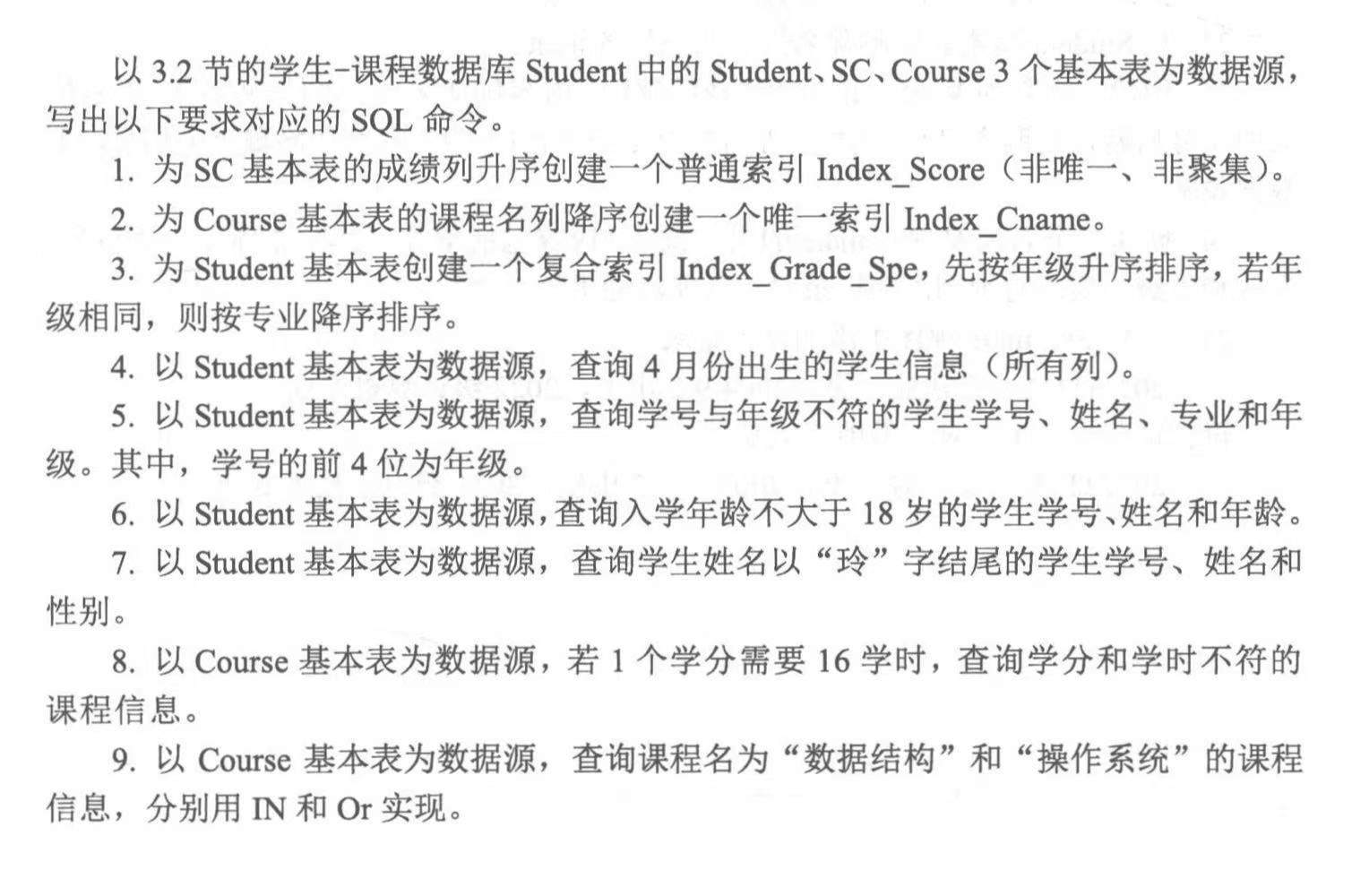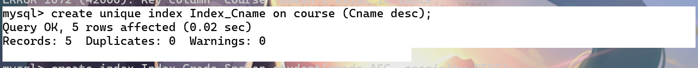 2.create unique index Index_Cname on course (Cname DESC);