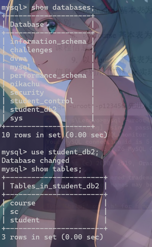 看一下数据库名字 我们数据插入在student_db2 所以进入student_db2 然后查表名