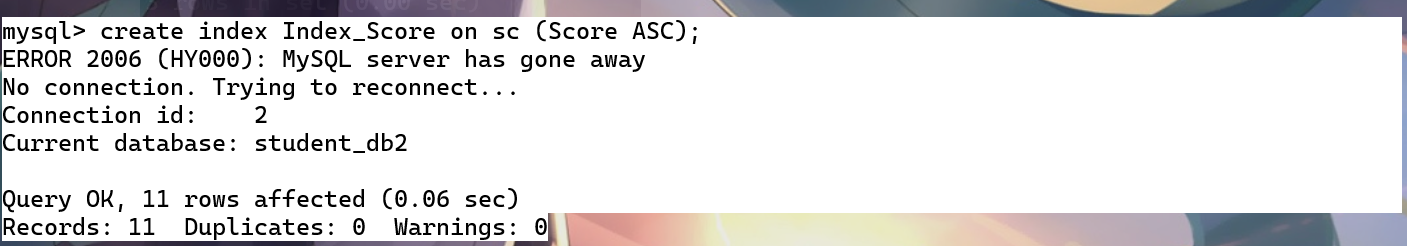 1.create index Index_Score on sc (Score ASC);