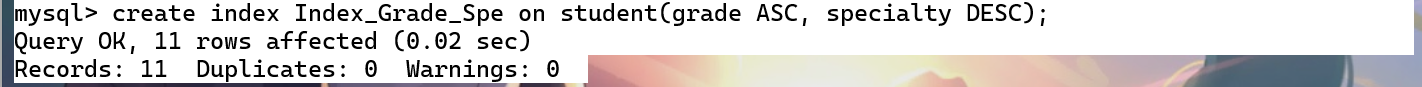 3.create index Index_Grade_Spe on student(grade ASC, specialty DESC);