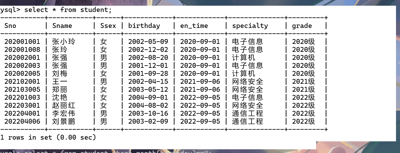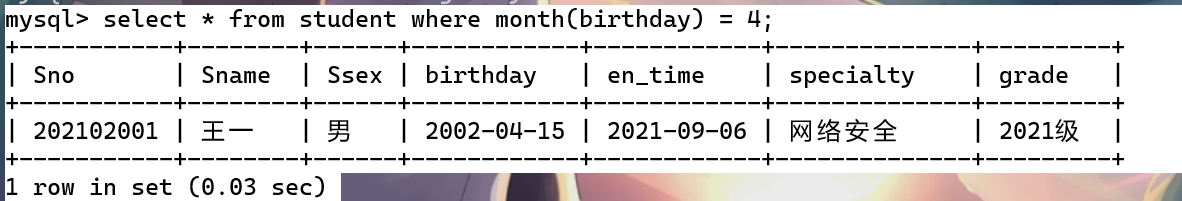 select * from student where month(birthday) = 4;