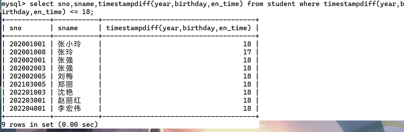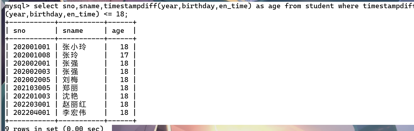 select sno,sname,timestampdiff(year,birthday,en_time) as age from student where timestampdiff(year,birthday,en_time) <= 18;