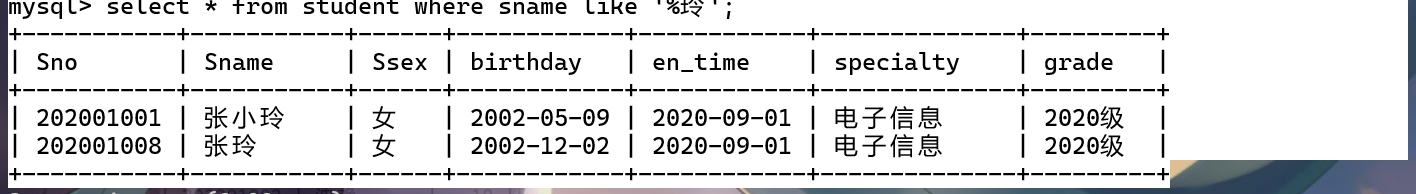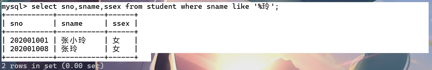 select sno,sname,ssex from student where sname like '%玲';
