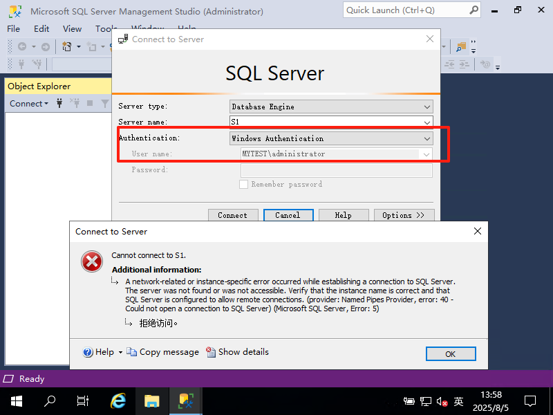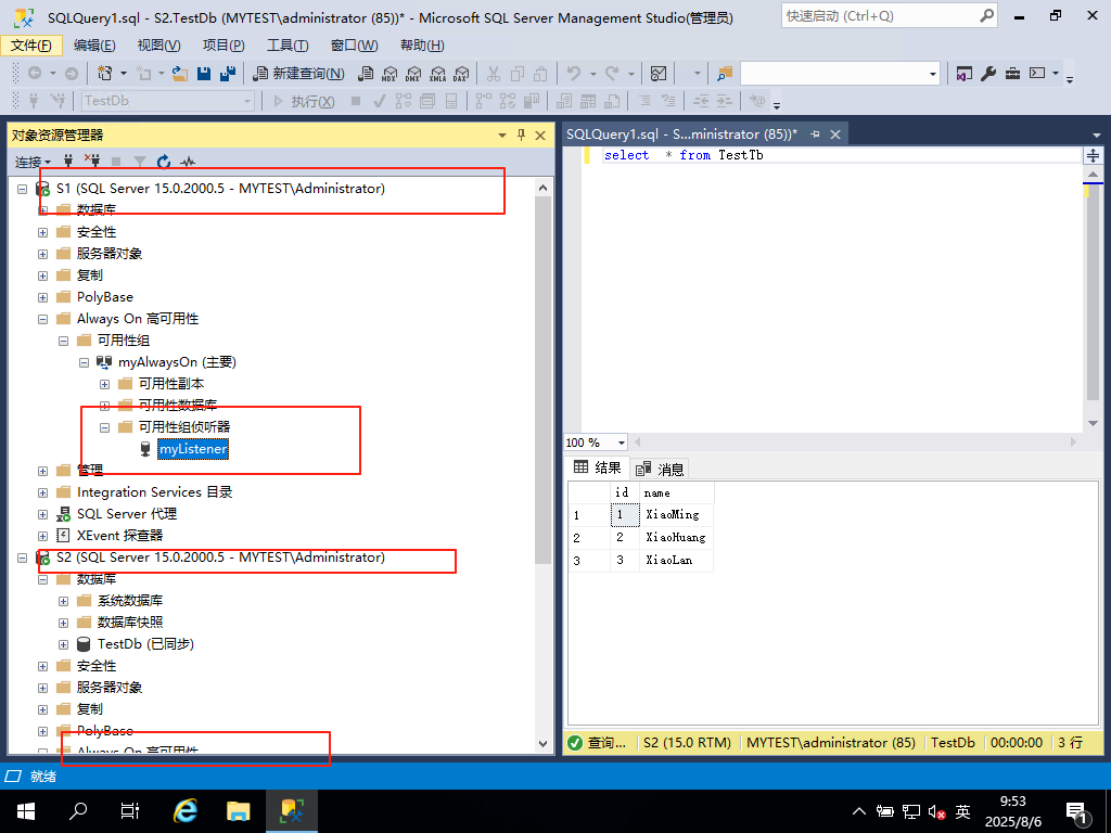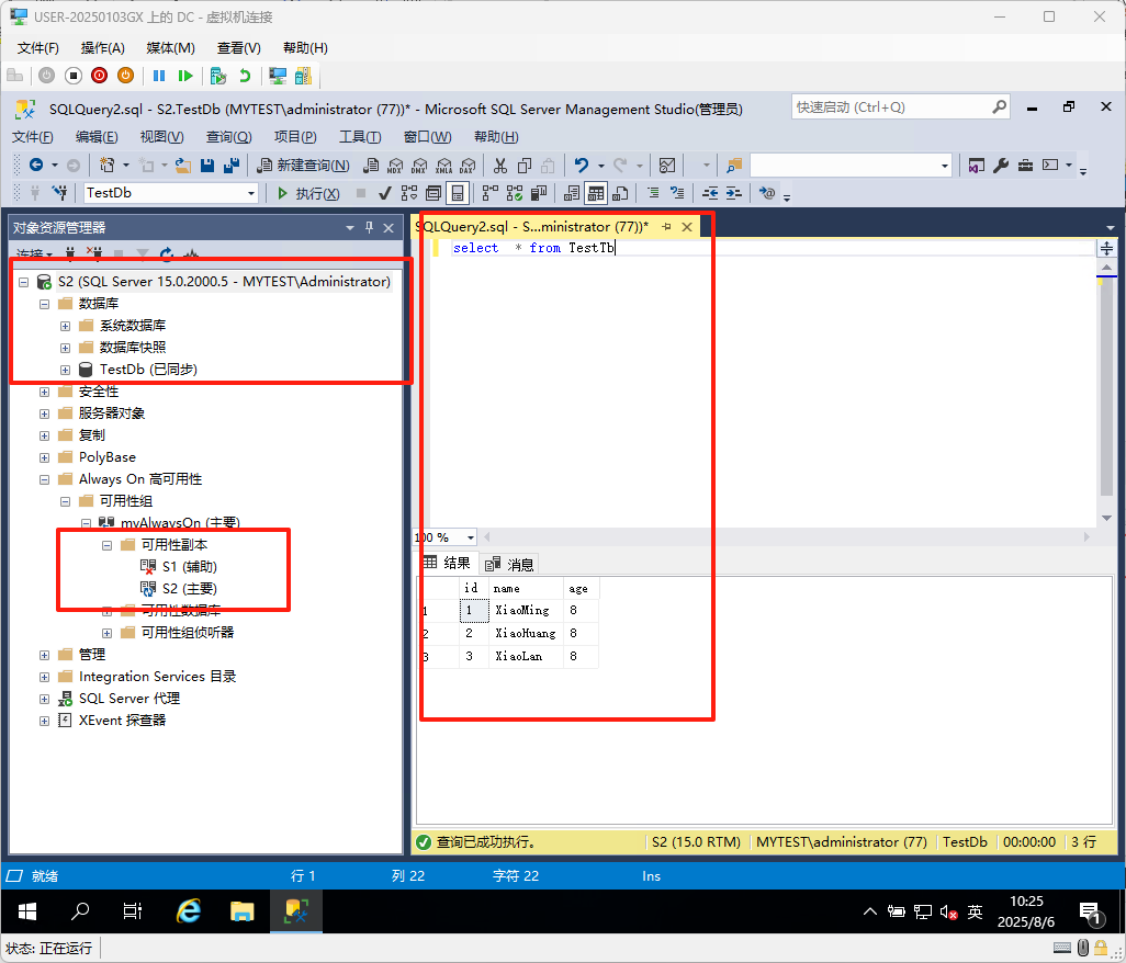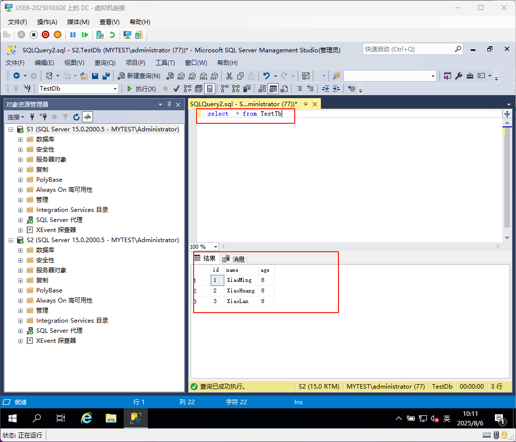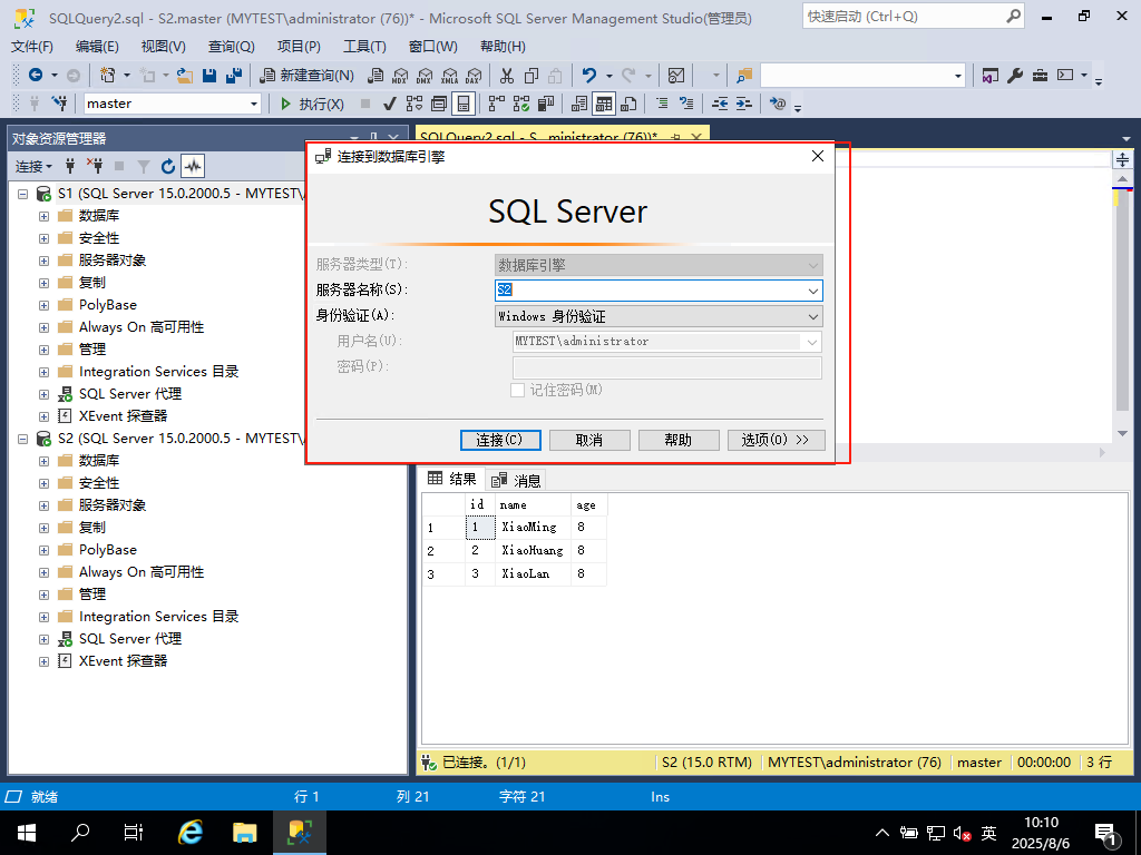 测试域账户登录,此时在DC服务器能够通过域账户登录S1和S2的数据库