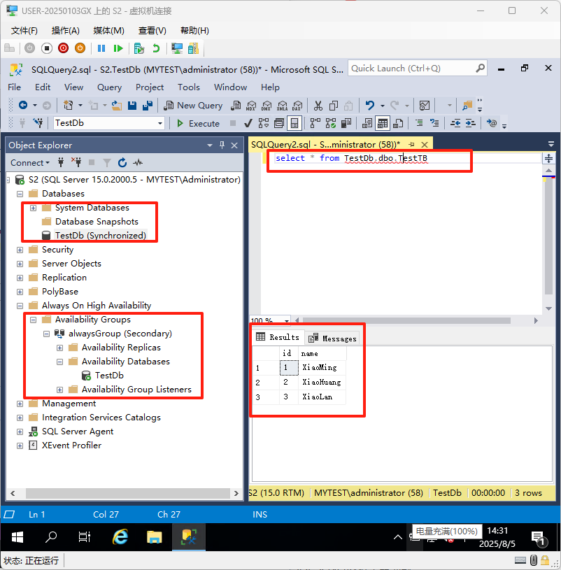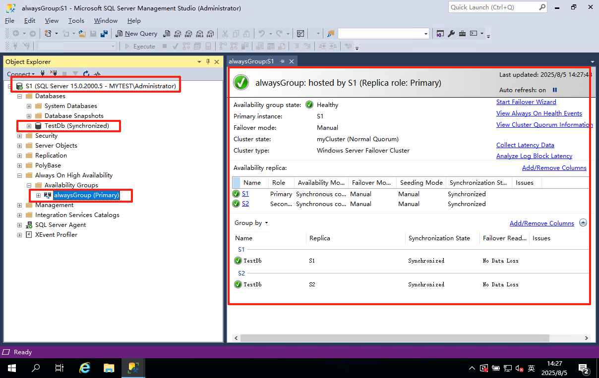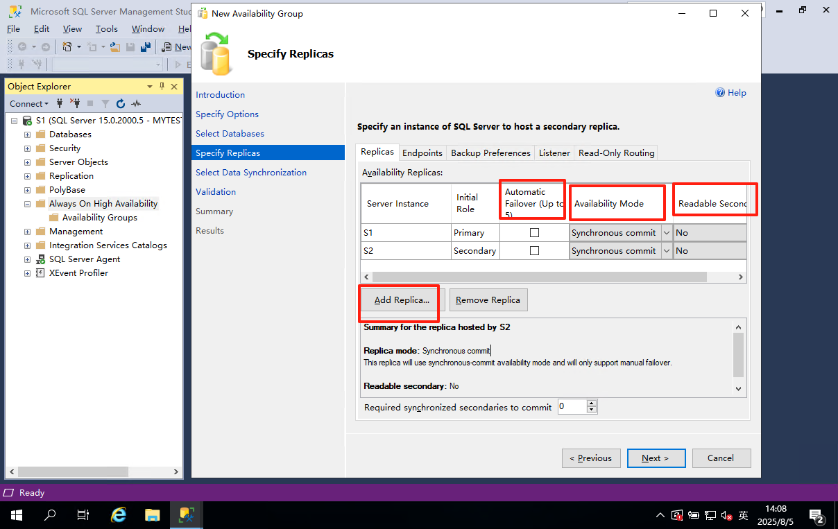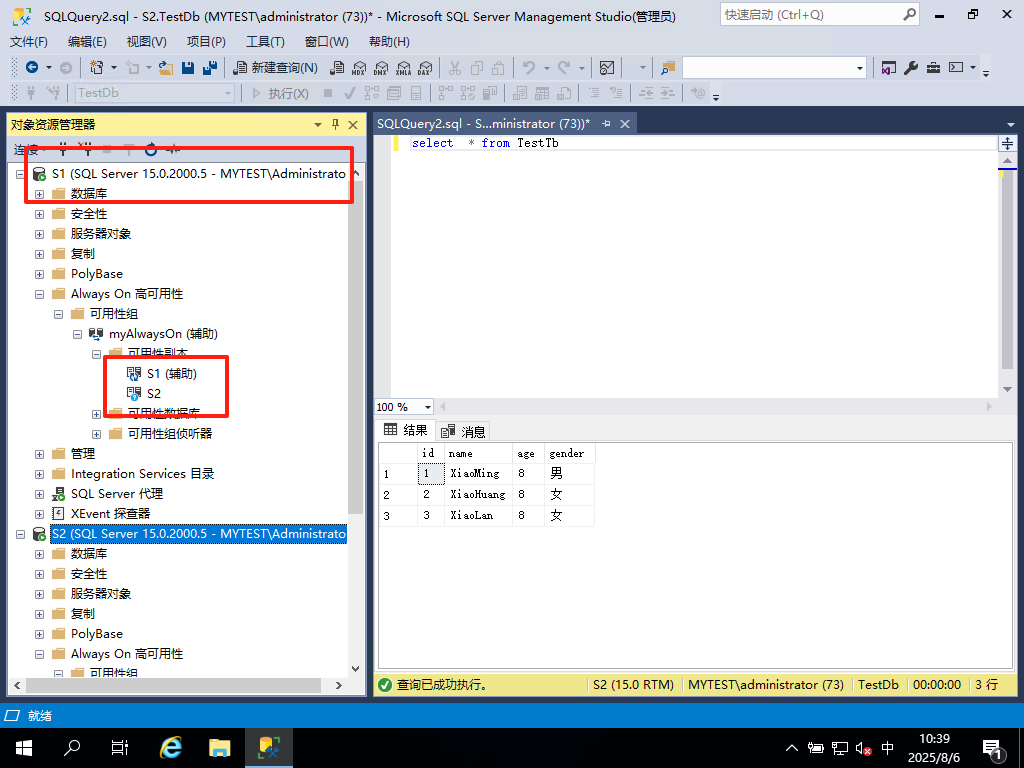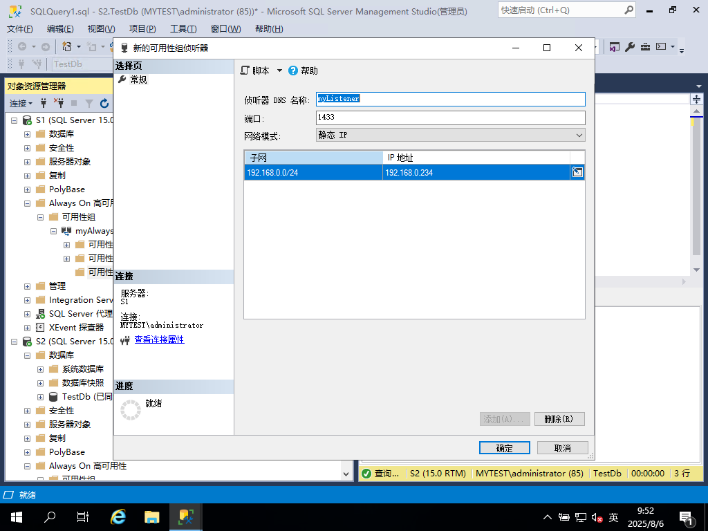 下一步至完成,此时可以在S1,S2数据库中查看Always on群组信息和同步信息