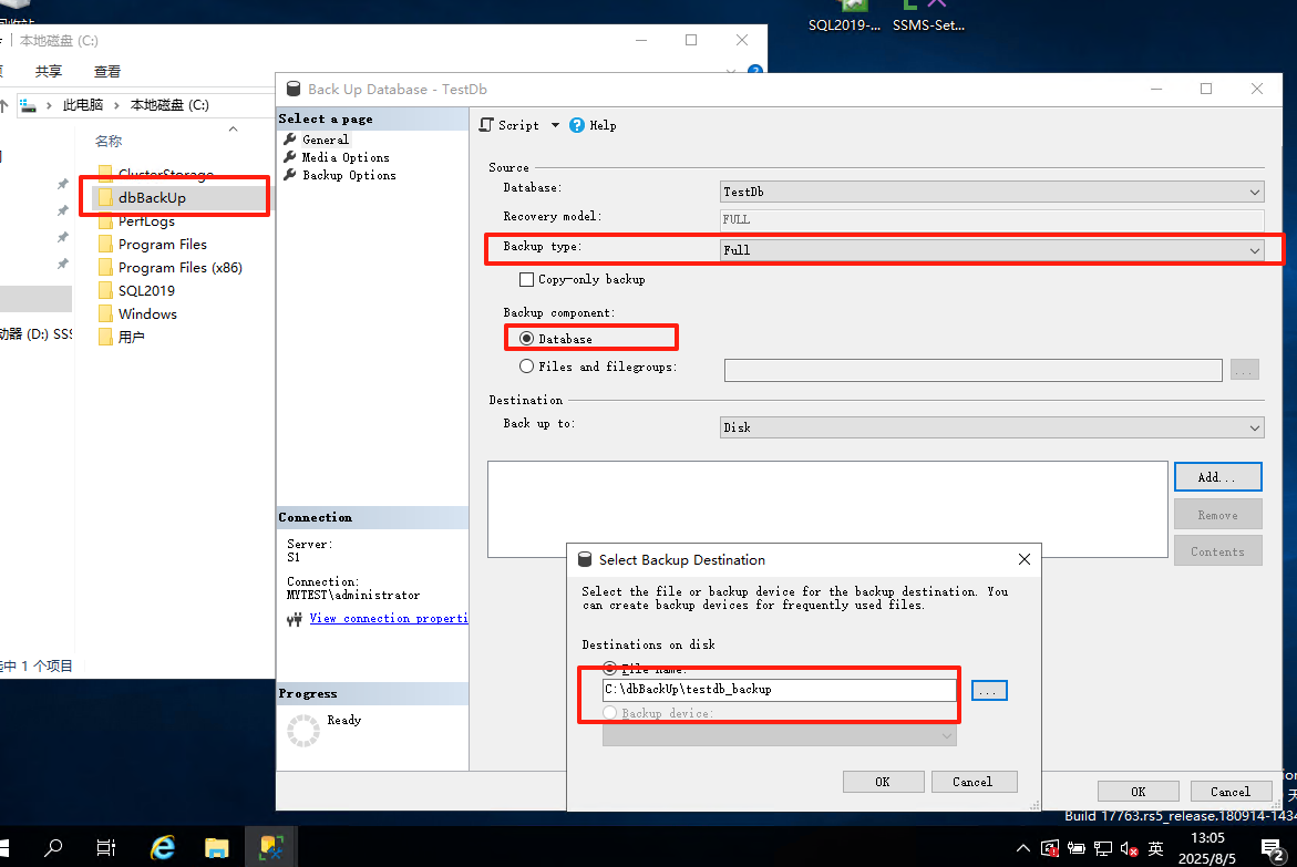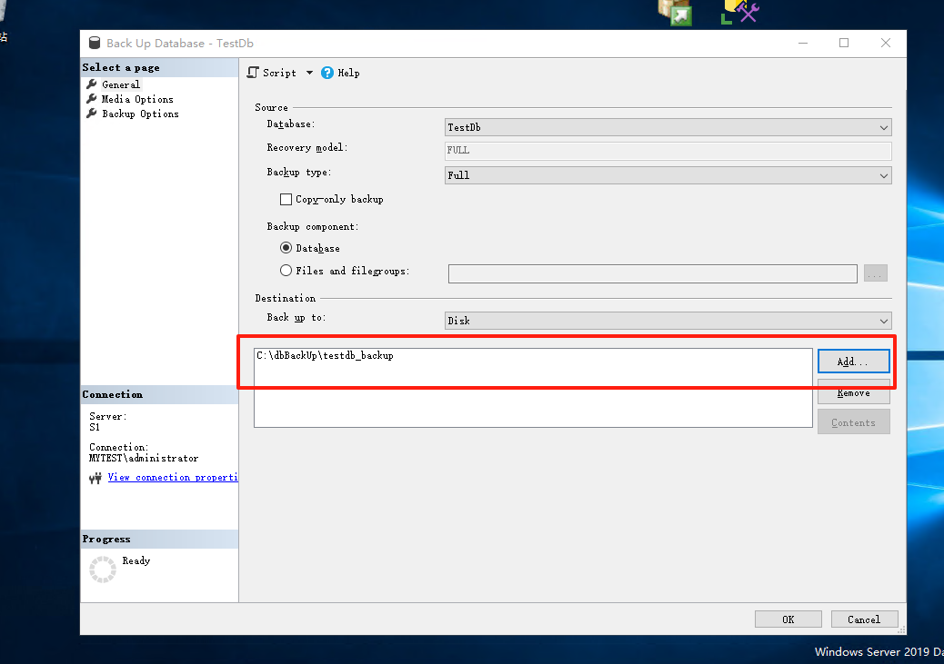 主服务器数据库做完整备份(比如S1中的TestDb)