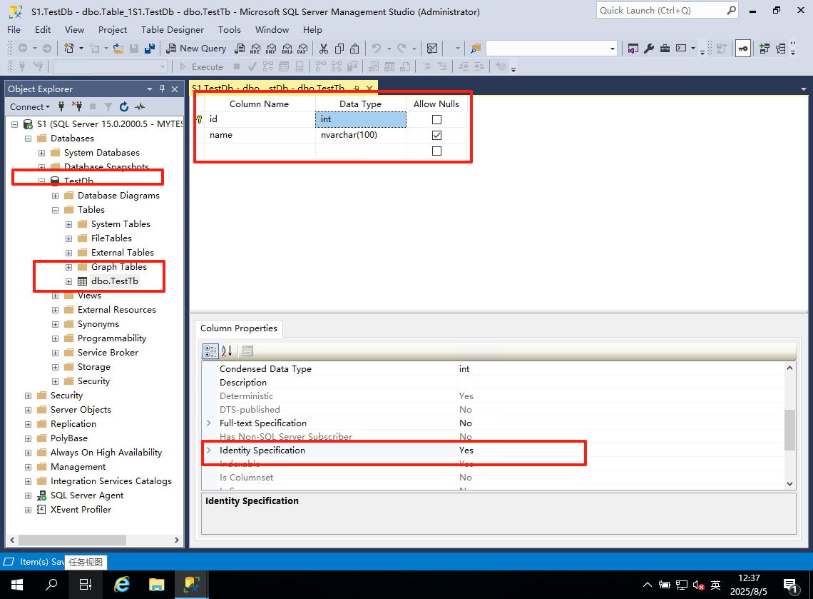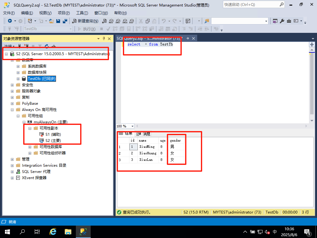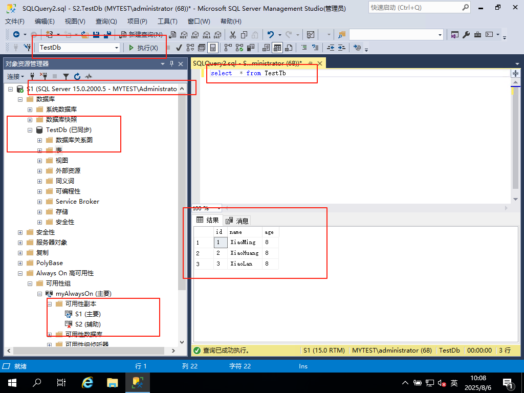 查看S1服务器材料并更新内容和结构, 给TestTb表中新增Age字段,并赋值8